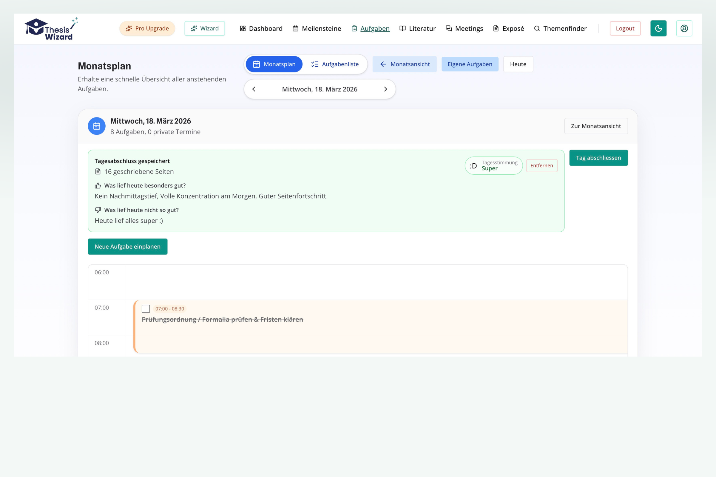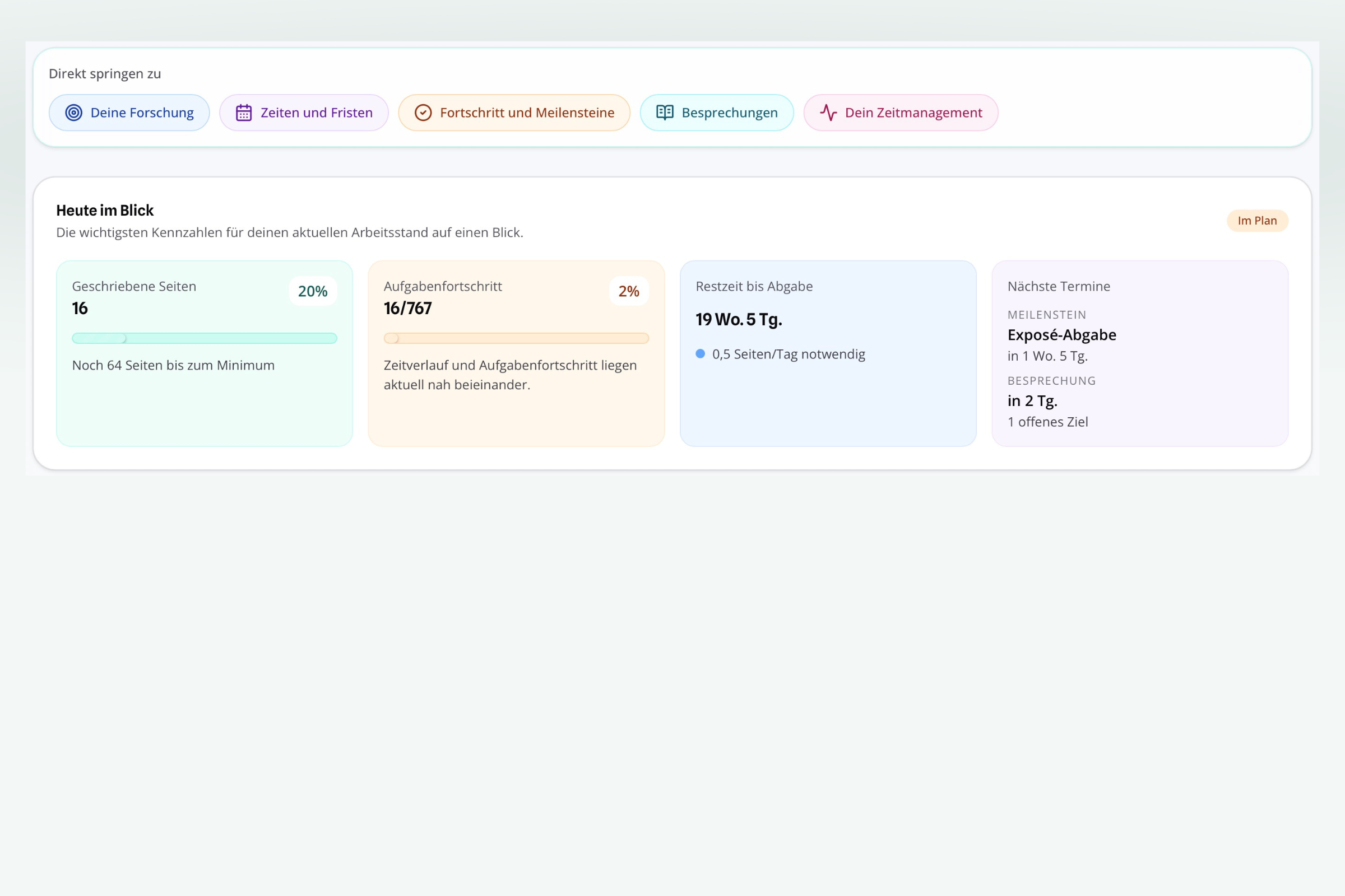 Die Monatsübersicht des Thesis-Planers bietet dir einen umfassenden Langzeitüberblick über deine verfügbare Zeit und alle anfallenden Aufgaben. Mit einer klaren und übersichtlichen Darstellung wird dir die detaillierte Planung deiner Arbeitsschritte erleichtert. Du kannst wichtige Meilensteine, Fristen und Abgabetermine problemlos eintragen und behältst stets den Überblick über den Fortschritt deiner Abschlussarbeit. Darüber hinaus ermöglicht dir die Übersicht auch eine effektive Zeitplanung für weitere Verpflichtungen wie Praktika, Nebenjobs oder andere Studienprojekte.
